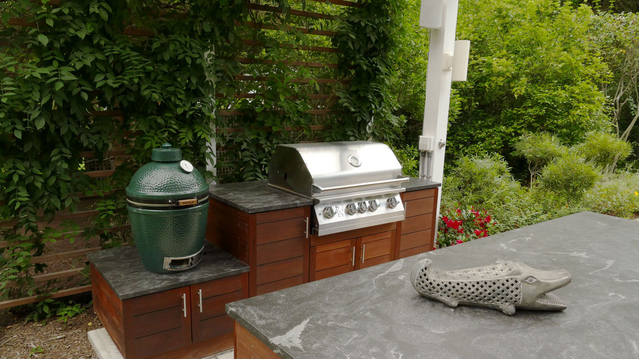 This landscaping renovation in a residential backyard featured a complete transformation, with the highlight being the creation and installation of a new outdoor kitchen. Designed for both functionality and style, the kitchen boasts top-of-the-line appliances, ample counter space, and a built-in grill. The surrounding space was thoughtfully landscaped with lush grasses, natural stone pathways, and a new seating area, creating a seamless flow between the kitchen and the rest of the yard. The result is an inviting and sophisticated outdoor environment that encourages both relaxation and socializing.